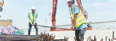 與普通作業面不同,這里橫跨江面,橋梁混凝土吸收的熱量伴隨著河水蒸發帶來的熱氣,讓人又曬又悶。