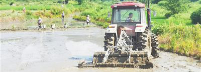 農機手正駕駛大型拖拉機在剛剛收割完畢的稻田里來回穿梭,翻耕平整,為栽插晚稻做準備。。