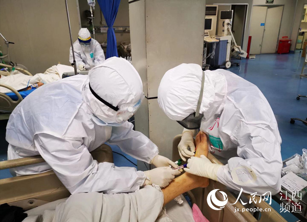 江西省中西醫結合醫院支援湖北醫療隊員在給病人做穿刺