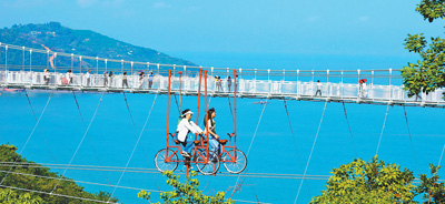 3日,浙江省玉環市干江鎮濱海旅游帶,游客在體驗高空自行車。吳達夫攝(人民視覺)