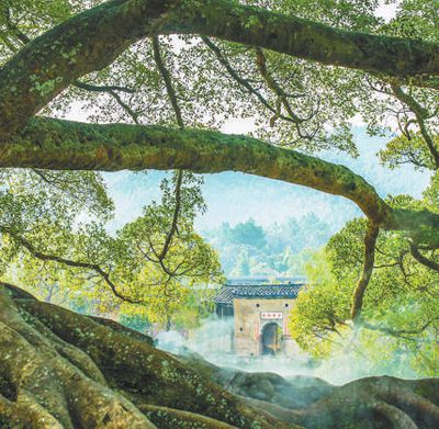 郁郁蔥蔥的古榕樹、清波蕩漾的池塘、搖曳的桂花樹、雕梁畫棟的鴛鴦廳、群山環繞的客家村落……