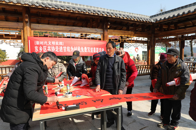 1月11日,江西省撫州市東鄉區甘坑林場開展新時代文明實踐活動,邀請區書法家協會志愿者為群眾百姓免費寫春聯、送福字,送上新春祝福,感受濃濃年味。(饒方其 攝)