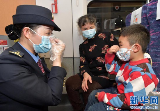 1月28日,在南昌發往婺源的D6264次列車上,乘務員向小旅客示范正確佩戴口罩的方法。