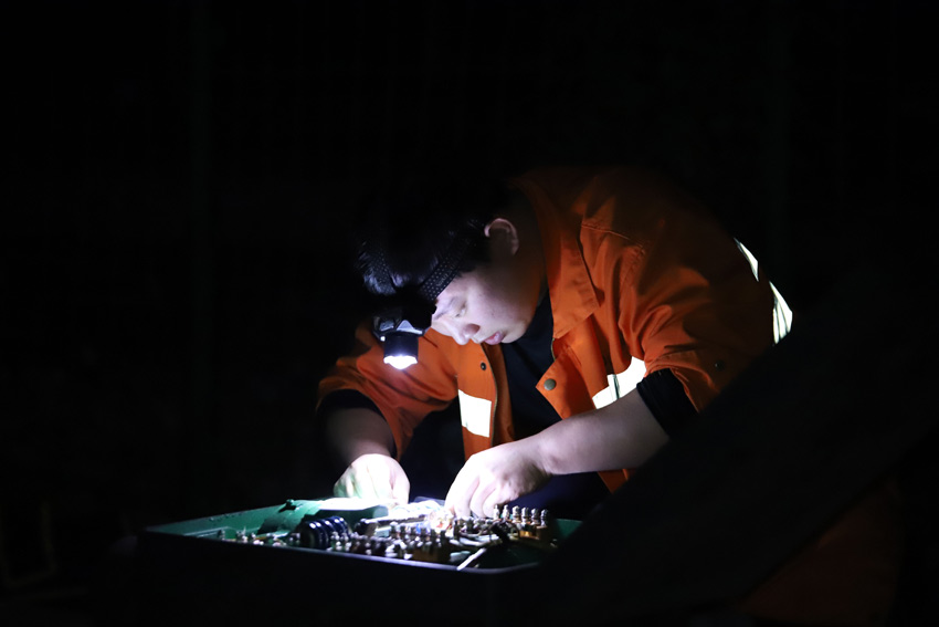 深夜,職工正在對信號電纜進行檢查。李正緯 攝