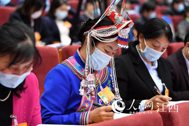 江西省十三屆人大五次會議上,代表們認真聽取《政府工作報告》。人民網 時雨攝