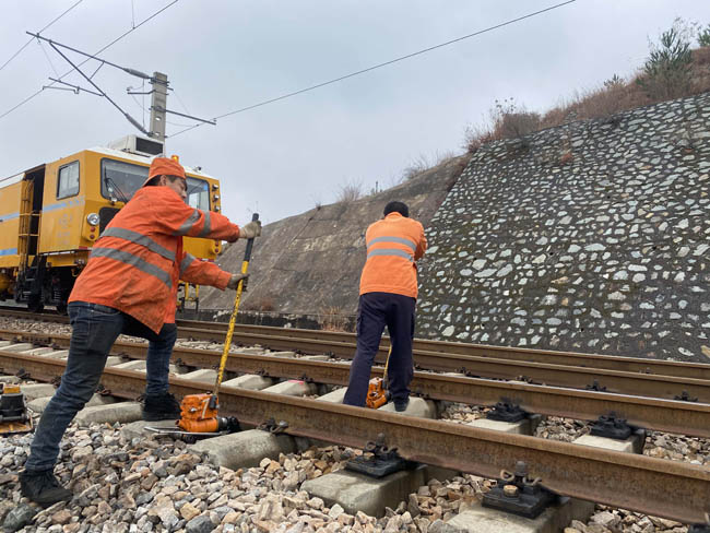 “搗固車主要是根據偏心軸搖擺振動原理,振動馬達帶動偏心軸高速旋轉,對石砟產生振動使其向穩定的方向移動和夾實枕間石砟使枕底石砟密實,提高軌道的穩定性!壁M韶鐵路大機搗固作業負責人朱小春說,“作業后,不僅使列車更平順地運行,之后一段時間里我們的作業量也會減小!