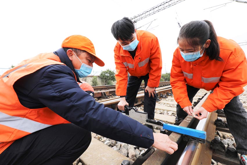 2021年2月3日,中國鐵路南昌局集團有限公司南昌工務段豐城線路車間的兩名95后女線路工,迎來了入職后的第一個春運,他們即將對滬昆線豐城境內鐵路道岔進行養護維修。(付映雪)