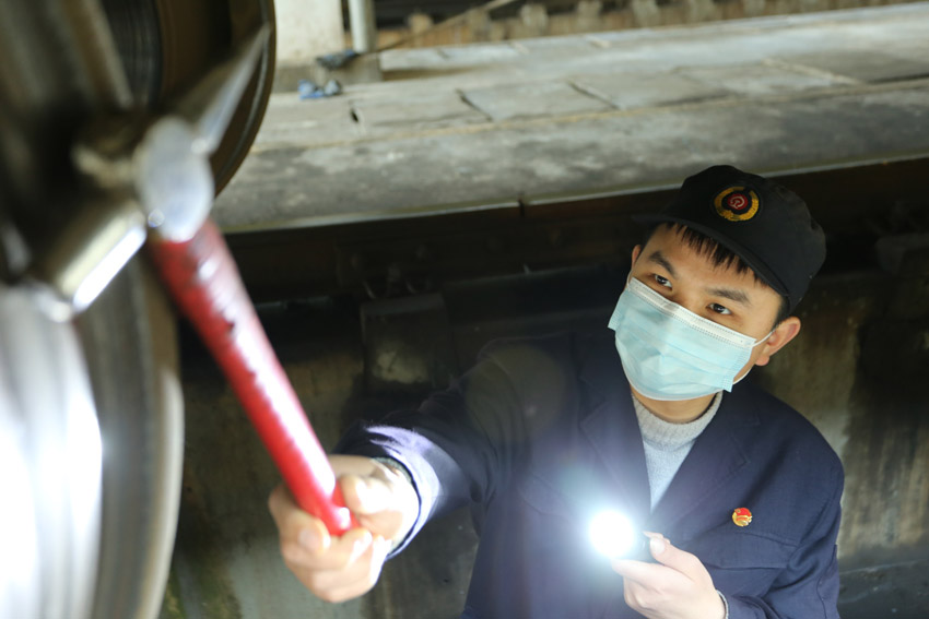 圖為工作人員在對車輪踏面進行技術檢查。王超 攝