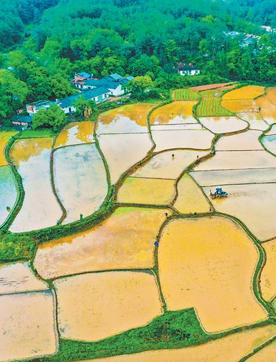 4月25日,在江西省贛州市章貢區沙石鎮樓梯村,村民正在田間拋栽早稻秧苗。春耕時節,贛州市章貢區組織農民搶抓農時,積極搶插搶種,田間地頭呈現一派繁忙景象。