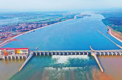 5月1日,江西贛江井岡山航電樞紐工程壩頂公路橋箱梁架設完工。這是一座以航運為主、兼有發電等綜合利用效益的大型航電樞紐工程。圖為井岡山航電樞紐工程俯瞰。