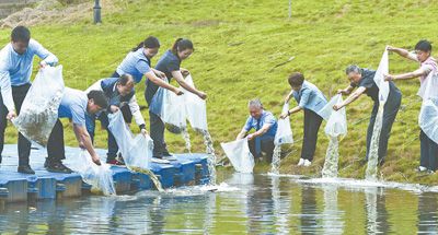 圖為5月20日,資溪縣政協委員和執法人員在九龍湖國家濕地公園放流萬尾魚苗。