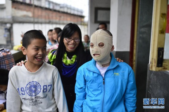 重返校園后,老師和同學們與周濤聊天談心(2014年11月5日攝)。新華社記者 周密 攝