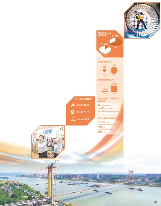 在中國共產黨的堅強領導下,我國經歷了世界歷史上規模最大、速度最快的城鎮化進程——我國常住人口城鎮化率由1949年末的10.64%提高到2020年的63.89%;全國城市和建制鎮數量從1949年末的132個、約2000個增長到2019年的684個、逾2.1萬個。
