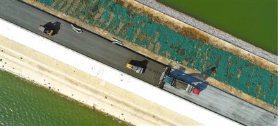 6月23日,在江西省九江市湖口縣鄱陽湖區單退圩堤南北港圩加固整治工程項目施工現場,施工人員正在攤鋪水穩層。該整治工程涉及堤線總長5.6公里,保護面積11.98萬畝,保護耕地面積8.03萬畝,受益人口7.96萬人。工程完工后,在防洪緊急關頭能夠發揮削減洪峰、蓄滯超額洪水、減輕洪水災害損失的作用。