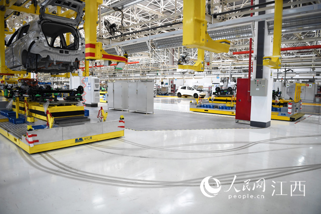 在贛州經開區一家汽車制造企業,智能機器人按照設定的路線將零件運送到生產線。人民網 時雨攝