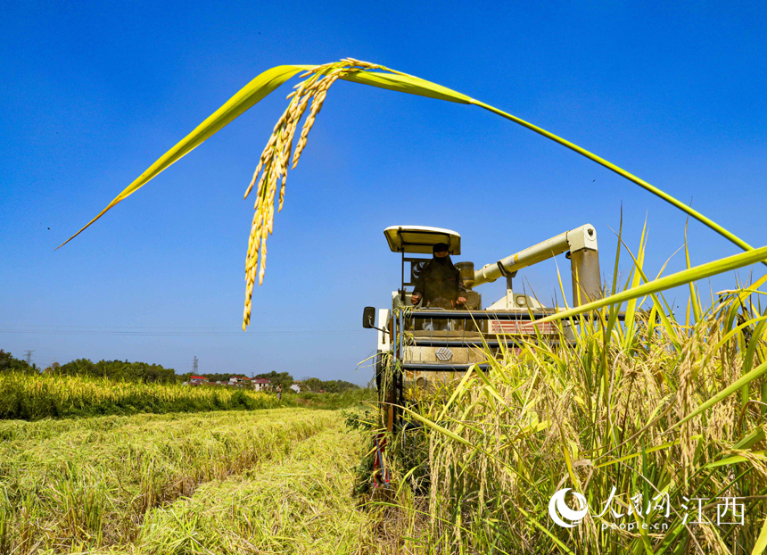 人民網南昌9月17日電 9月16日,江西省吉安市吉州區樟山鎮清湖村,農民駕駛收割機在田間忙碌,確保稻谷顆粒歸倉。(毛思遠  李軍)