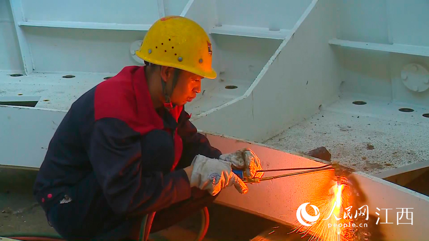 在江西贛江井岡山航電樞紐項目建設工地,施工人員在作業。郭瑤攝