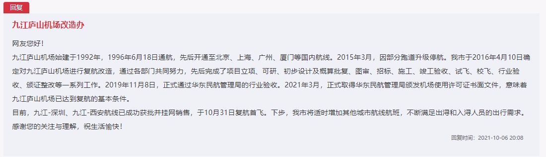 網友留言中提到的機場,實為九江廬山機場。九江廬山機場改造辦在回復中介紹,2015年3月,九江廬山機場因部分跑道升級停航。2016年4月,九江市確定對廬山機場進行復航改造,先后完成了項目立項、可研、初步設計及概算批復、圖審、招標、施工、竣工驗收、試飛、校飛、行業驗收、頒證整改等一系列工作。2019年11月8日,正式通過華東民航管理局的行業驗收。2021年3月,正式取得華東民航管理局頒發機場使用許可證書面文件,意味著九江廬山機場已達到復航的基本條件。