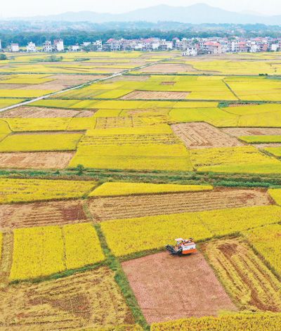 金秋時節,江西省贛州市興國縣的晚稻迎來收獲季。圖為10月9日,興國縣長岡鄉塘石村的農民正在收割晚稻。