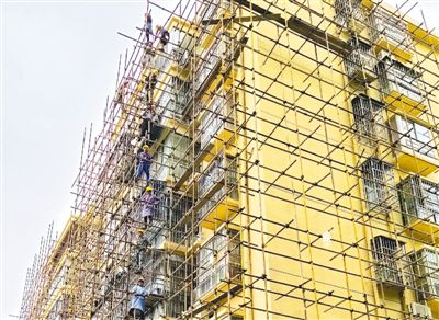 江蘇省宿遷市泗陽縣一小區改造提升施工現場,工人正對小區外墻進行維修補強工作。
