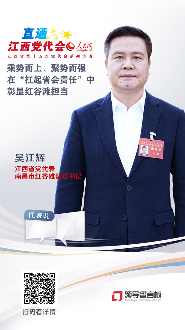 人民網:在江西省第十五次黨代會開幕大會上,易煉紅同志代表中國共產黨江西省第十四屆委員會作的報告,吹響了未來五年江西發展的號角。請問吳江輝代表,紅谷灘區將如何貫徹落實省黨代會精神?