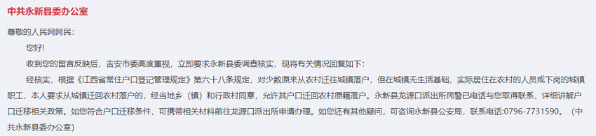 收到網友留言后,吉安市委高度重視,立即要求永新縣委調查核實。經核實,根據《江西省常住戶口登記管理規定》第六十八條規定,對少數原來從農村遷往城鎮落戶,但在城鎮無生活基礎,實際居住在農村的人員或下崗的城鎮職工,本人要求從城鎮遷回農村落戶的,經當地鄉(鎮)和行政村同意,允許其戶口遷回農村原籍落戶。
