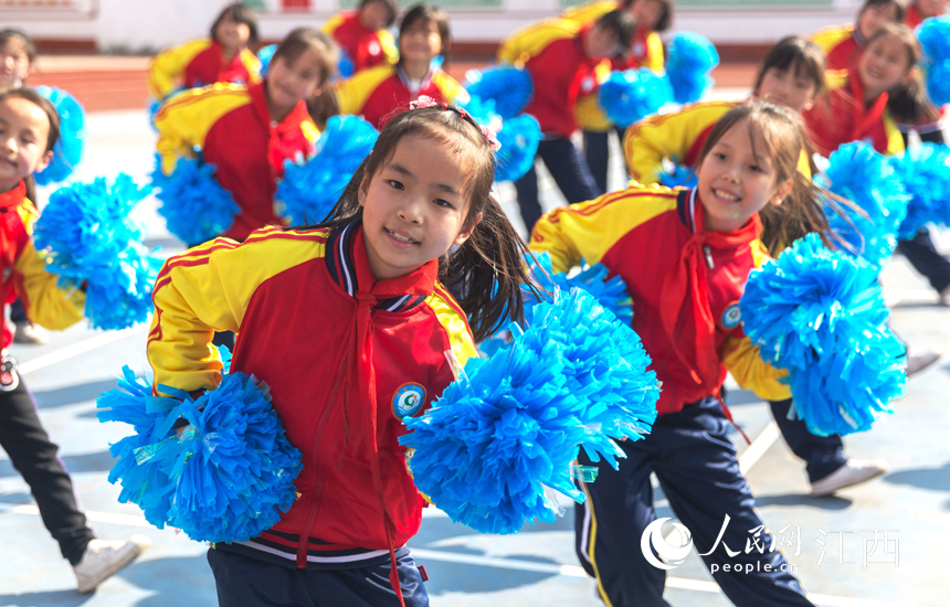 永新縣高溪鄉高溪小學的學生在練習跳啦啦操。周亞茂攝