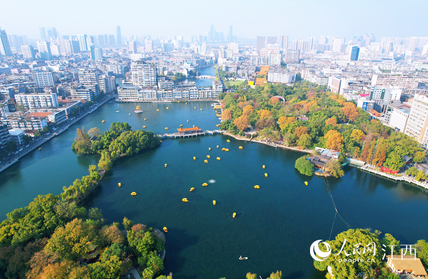 南昌市八一公園色彩斑斕,游人如織(無人機照片)。人民網 毛思遠攝