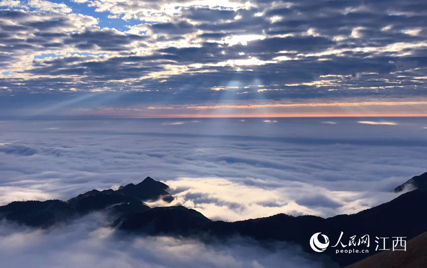 武功山風景名勝區出現罕見的超級“瀑布”云海景觀。謝凌陽攝
