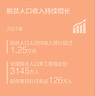 去年以來,各地區各部門集中資源、集中力量、接續奮斗,脫貧攻堅成果得到鞏固拓展,全面推進鄉村振興實現良好開局。數據顯示,脫貧地區特色產業穩步發展,截至2021年12月底,全國脫貧人口務工規模達3145萬人,超年度目標任務近126萬人。脫貧人口人均純收入預計超過1.25萬元,比2020年增長16.5%以上?傮w看,牢牢守住了不發生規模性返貧底線。