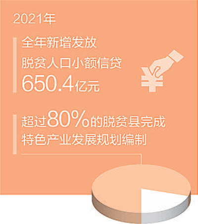 發展產業是鞏固拓展脫貧成果的治本之策,也是鄉村振興的長遠之計。各地加強規劃引導、加大資金投入,加快補齊技術、設施、營銷等短板,促進脫貧產業提檔升級。去年全國新增發放脫貧人口小額信貸650.4億元,支持155.7萬戶發展生產。超八成的脫貧縣完成特色產業發展規劃編制,脫貧地區特色產業穩步發展壯大。