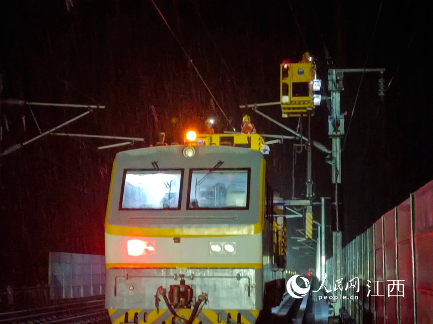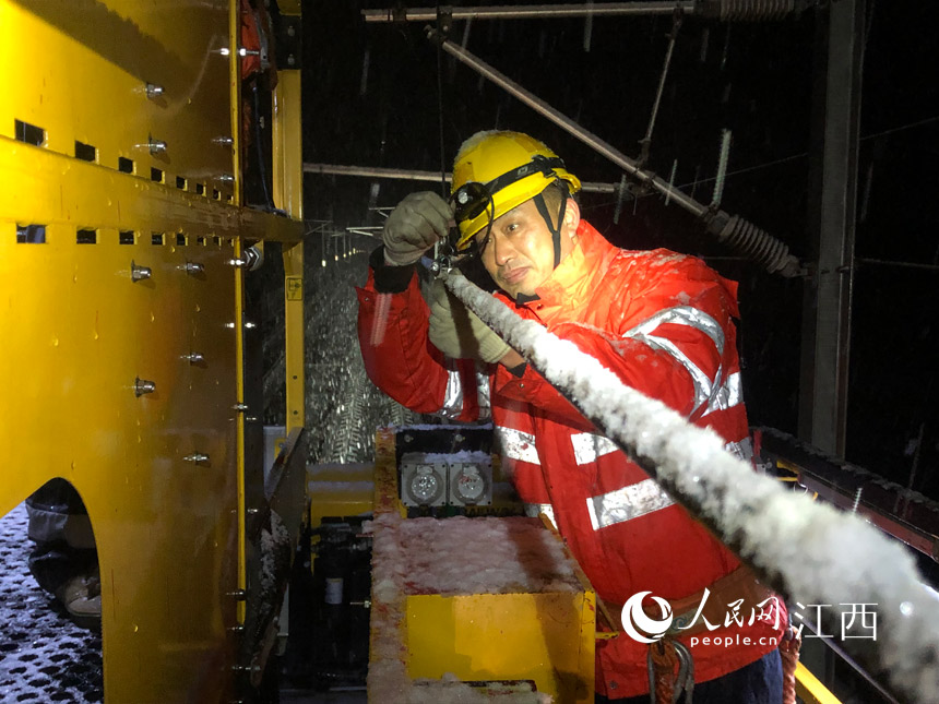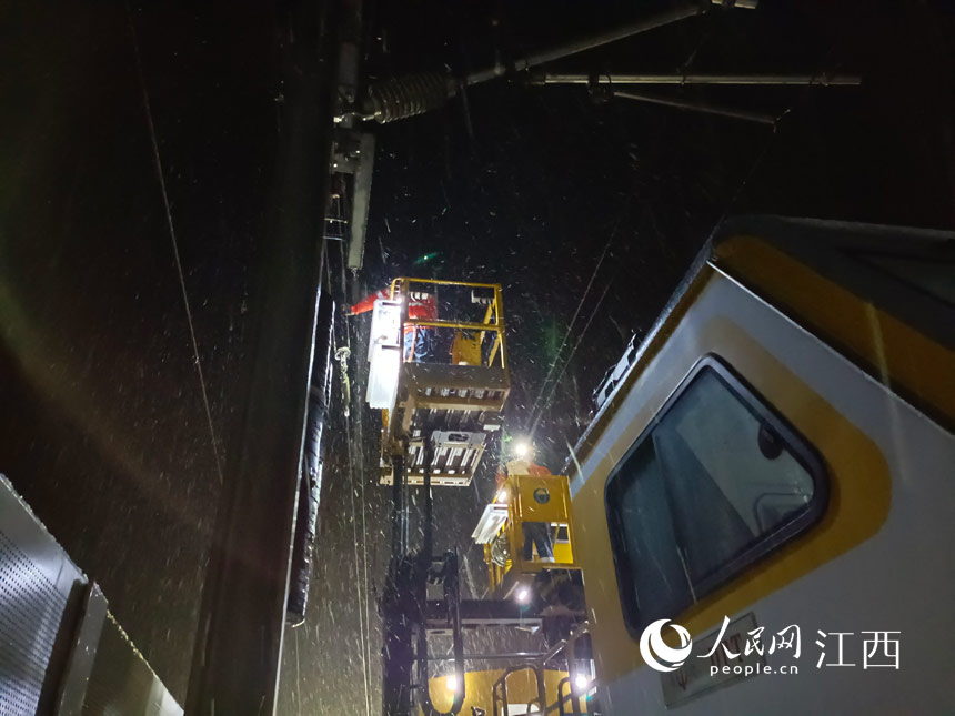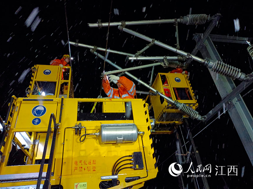 南昌高鐵基礎設施段接觸網維修人員冒著嚴寒除冰。 張瑞攝