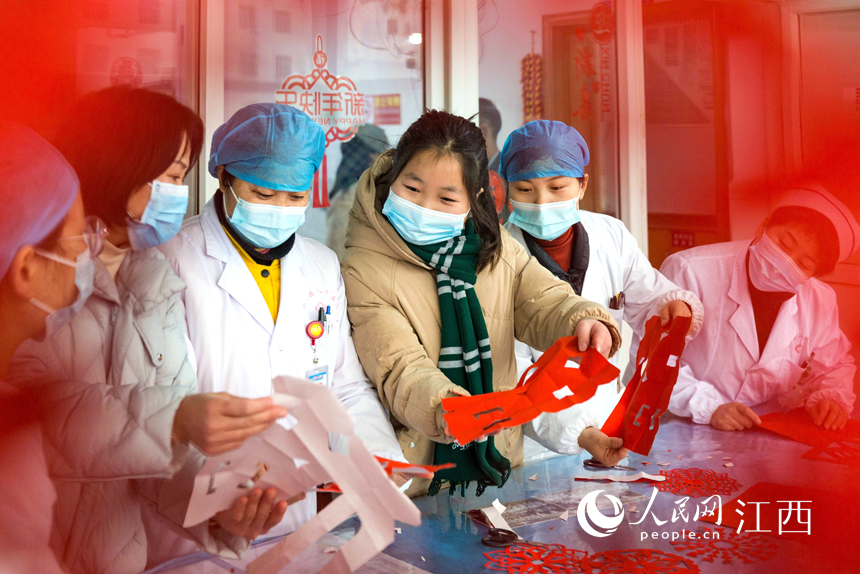 醫護人員與患者家屬一道剪窗花。劉平華攝