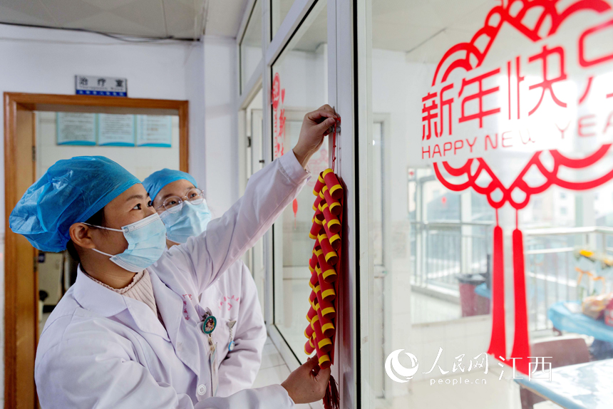人民網南昌1月30日電 1月29日,江西省永新縣人民醫院婦產科的醫護人員仍默默堅守在工作崗位上,為人民群眾的身體健康保駕護航。醫院為了給病患們過上一個溫暖的春節,在病房裝扮上了燈籠、窗花、大紅福字,洋溢著歡樂祥和的濃濃年味兒。(邱燁、朱國朝)