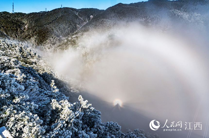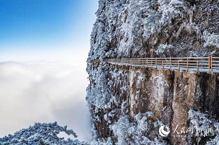 人民網南昌2月2日電(毛思遠)1月31日,受冷空氣影響,江西明月山喜降瑞雪,雨淞、雪淞,冰瑩玉潔,璀燦耀目,呈現出“千崖冰玉里,萬峰水晶中”的絢麗風光。給歡度新春佳節的人們帶來了不少驚喜和樂趣。