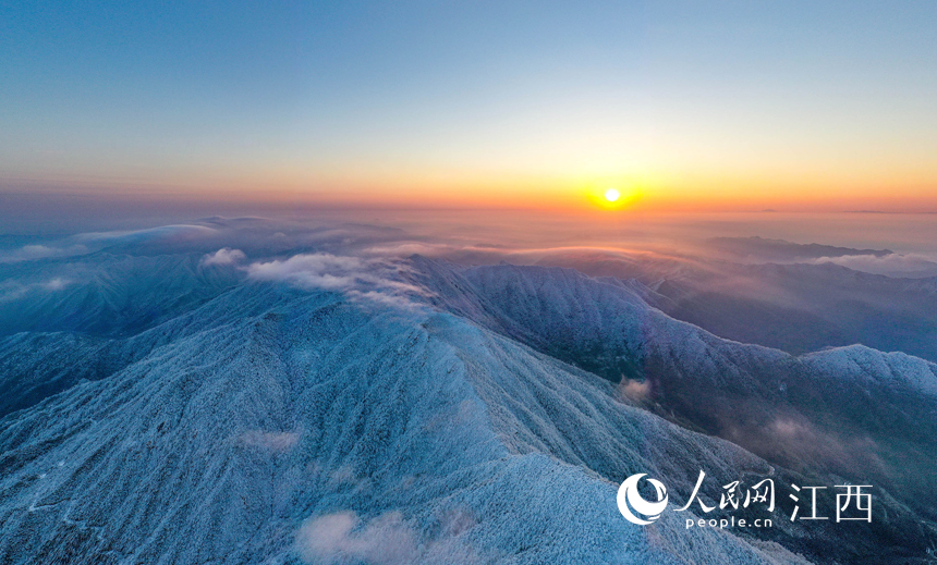 人民網南昌2月9日電  虎年春節,江西省九江市武寧縣太平山景區連續降雪后,迎來晴朗天氣,景區出現了難得一見的朝陽映照云海霧凇奇觀,給前來觀景游玩的游客展現了一幅壯麗的動感十足的南國冰雪畫圖。(邱燁、蔣德先