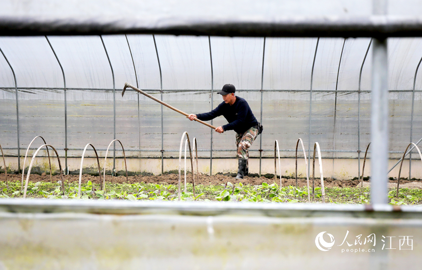 2月13日,菜農在江西省宜豐縣黃崗山墾殖場獅子崗分場大棚蔬菜基地整土準備種菜。何賤來攝