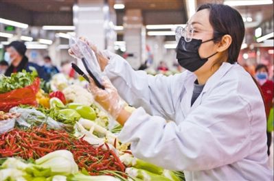 江西省南昌市東湖區賢士湖花園菜場內,檢測人員正在對當天采集的菜品進行快速檢測。時 雨攝(影像中國)