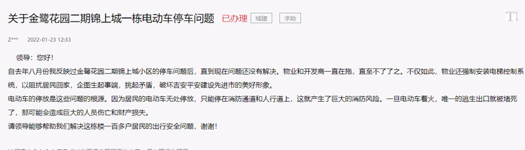 人民網南昌2月18日電(記者邱燁)“自2011年8月反映過金鷺花園二期錦上城小區的停車問題后,直到現在還沒有解決。物業和開發商一直在拖,直至不了了之!本W友通過人民網“領導留言板”向江西省吉安市吉州區委書記留言,反映小區電動車停車難問題。