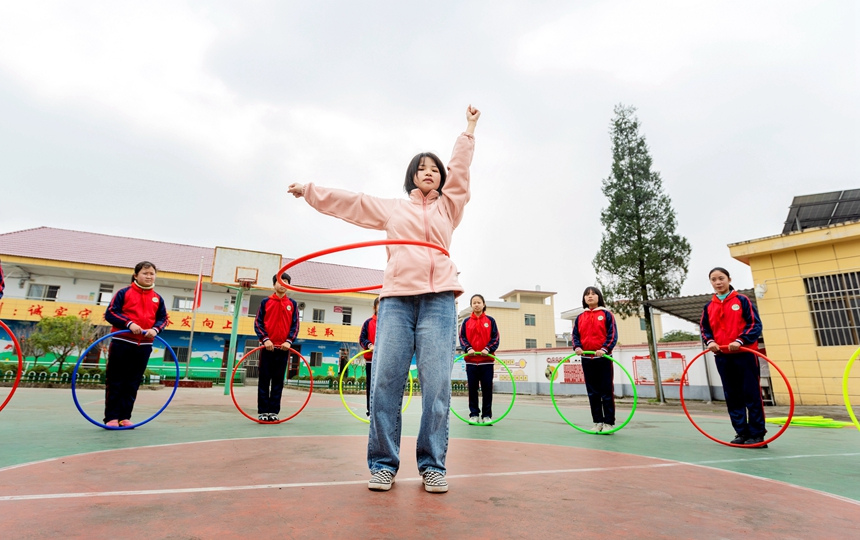 老師在給呼拉圈興趣小組的學生做示范。劉平華攝