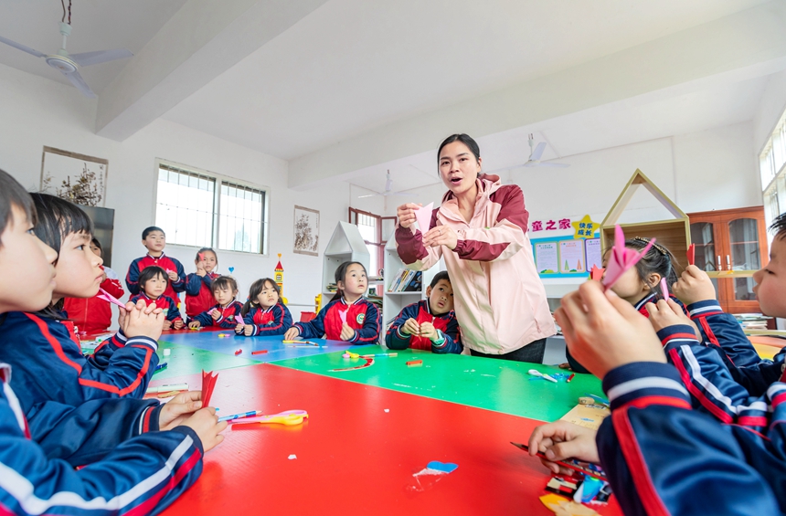 剪紙興趣小組的學生在老師指導下學習剪紙。周亞茂攝