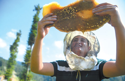 在精準脫貧工作隊的幫助下,湖南省湘西土家族苗族自治州花垣縣十八洞村村民學習養蜂技術,實現增收致富。圖為養蜂戶查看蜂巢。