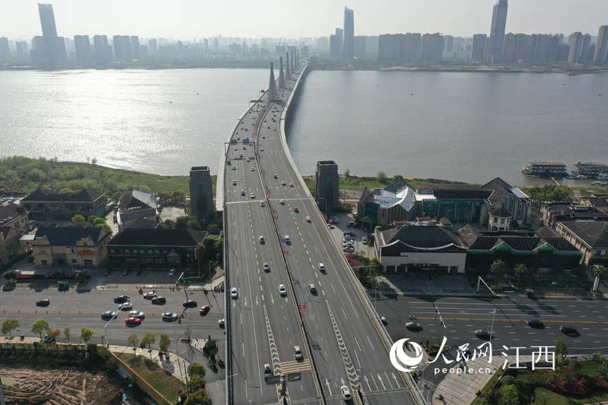 28日,南昌恢復常態化疫情防控。航拍鏡頭下,南昌紅谷灘區的大街上車水馬龍。 人民網 時雨攝