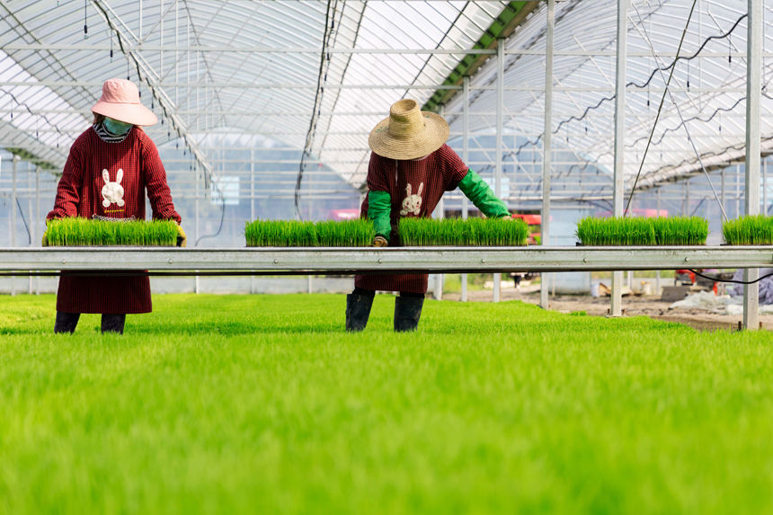 在江西省永新縣高橋樓鎮拿溪村水稻育秧工廠,當地農民利用智能軌道運送秧苗。周亞茂攝