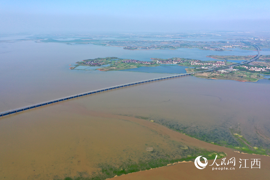 人民網南昌4月12日電(時雨)12日,在航拍鏡頭下,江西鄱陽湖的核心湖區金溪湖水漲船高,陽光下的湖面波光粼粼,高速公路的橋梁穿湖而過,冬季里才有的草灘綠洲逐漸被湖水淹沒。