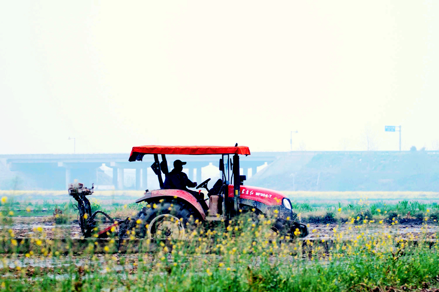 農民駕駛翻耕機在田間耕作。虢天明攝