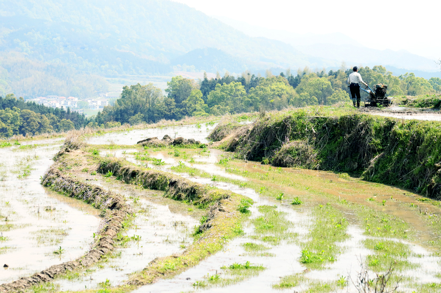 農戶在宜豐縣黃墾鎮牛頭嶺高山梯田操作農機翻地。何賤來攝