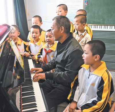 山西省晉城市陽城縣次營鎮中心學校,鄉村教師武愛國在音樂課上教學。