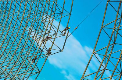 近日,江西省九江市柴桑區赤湖作業區公用碼頭散貨膠囊倉庫工地上,工人在鋼結構網架上組裝施工。