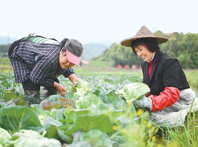 江西省上饒市鉛山縣永平鎮萬畝蔬菜基地,村民在采收包心菜。